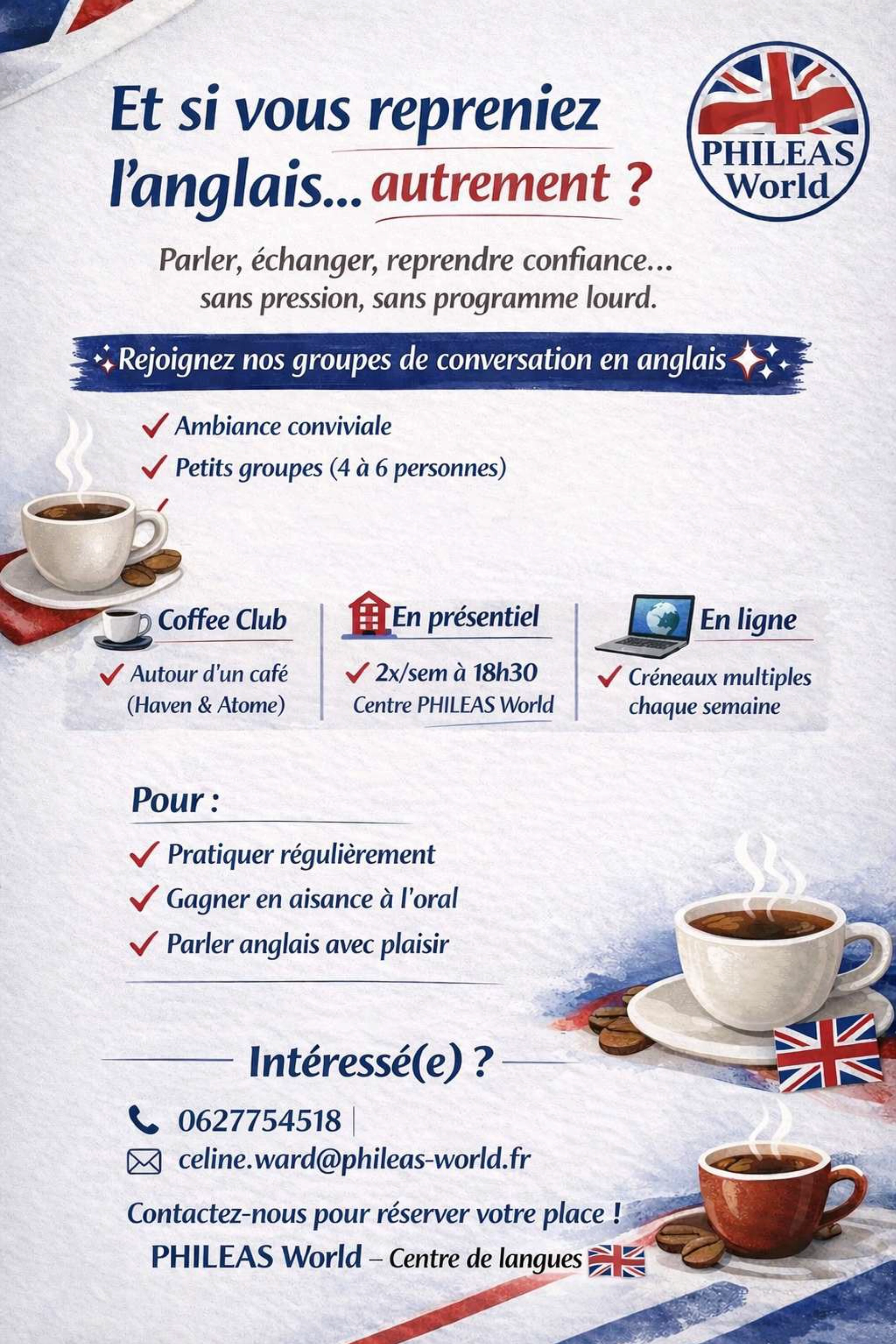 C’est là que des structures comme PHILEAS World Annecy font toute la différence. Le centre propose notamment des groupes de conversation en anglais, spécialement conçus pour pratiquer de manière régulière, sans pression et dans une ambiance conviviale.